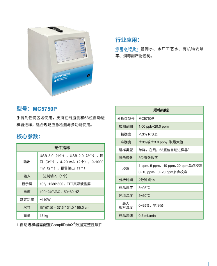 型号:MC5750P 手提到任何区域使用,支持在线监测和63位自动进 样器进样,适合现场应急检测与多功能使用。 行业应用: 饮用水行业:管网水、水厂工艺水、有机物去除 率、消毒副产物控制。